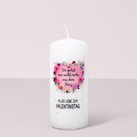 You light the light of affection with our candle and the following inscription „Du gehst mir nicht mehr aus dem Herz. Alles Liebe zum Valentinstag“ (I can't get you out of my heart. All the best for Valentine's Day.).