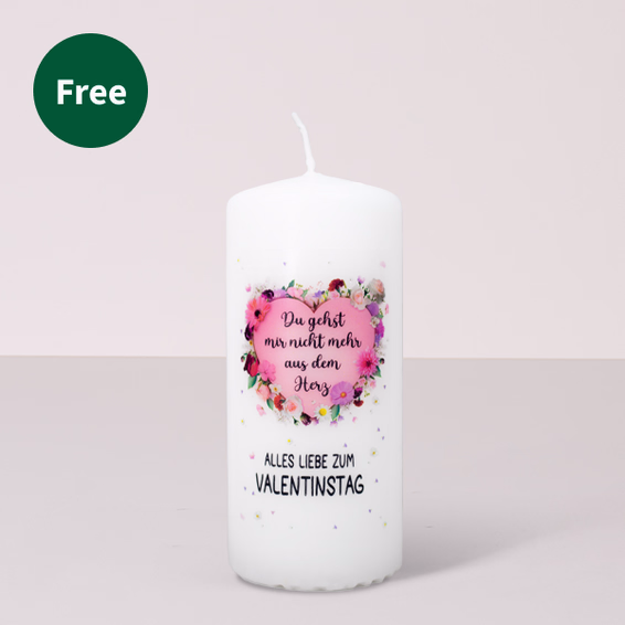 You light the light of affection with our candle and the following inscription „Du gehst mir nicht mehr aus dem Herz. Alles Liebe zum Valentinstag“ (I can't get you out of my heart. All the best for Valentine's Day.).