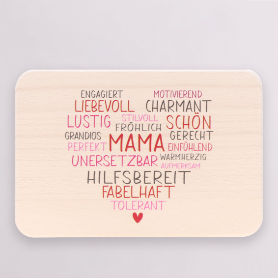 This breakfast board is more than just a practical kitchen accessory - it's a loving gift for the best mom in the world! With the enchanting inscription „Mama“ (Mom) and surrounded by a multitude of positive, loving words, it shows at a glance just how special your mom is. A little piece of love for the wonderful woman who is always there for you!