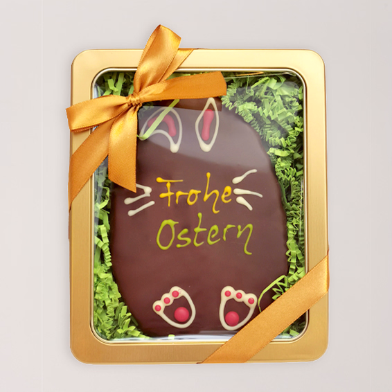 A Sacher cake covered in delicate milk chocolate and decorated with a sweet Easter bunny and the inscription „Frohe Ostern“ (Happy Easter). This delicious cake is the perfect gift or an indulgent treat for Easter - for anyone who loves chocolate and tradition. A festive treat that will make hearts beat faster! Weight: approx 300 g. The box is delivered in a fail-safe gift box.
