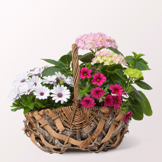 This charming natural basket with handle (approx. 26 x 17 cm) is planted with a delicate pink hydrangea, a pink mini petunia and a white cape daisy. A harmonious flower arrangement that brings freshness and colour to your home. Perfect for the balcony, windowsill or as a table decoration - an enchanting eye-catcher for spring.