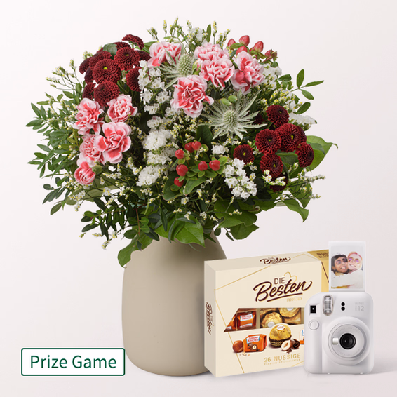 Classic Christmas colours elegantly combined: red santini balls, red and white spray carnations and red hypericum are stylishly contrasted with white statice, white thistles and white limonium. Pistochia and salal form the fresh green frame. Diameter about 30 cm. Freshly tied for you with care tips, flower food and water.