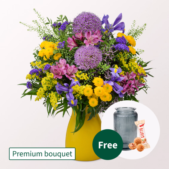 Yellow santini balls are combined with blue allium, blue statice and blue iris to create a clearly structured colour composition. Lilac coloured limonium, solidago and pink alstroemerias add movement and floral depth. Thlaspi, pistochia and chico jumbo form the lush green foundation of this premium bouquet. Diameter about 40 cm. Freshly tied for you with care tips, flower food and water.