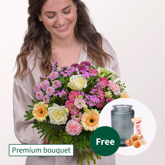 White and pink lisianthus meet pink and rose coloured santini balls. Pink statice and white roses create a soft, harmonious floral display. Pink carnations, cream coloured germini, pistochia and chico jumbo round off this premium bouquet. Diameter about 35 cm. Freshly tied for you with care tips, flower food and water.