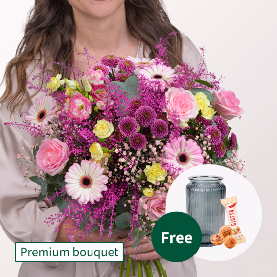 White and pink germini are combined with pink roses Avalanche. Pink coloured thlaspi and light pink gypsophila add lightness to the arrangement. White and pink lisianthus, light yellow spray carnations, pink santini balls and eucalyptus complete the composition. Diameter about 55 cm. Freshly tied for you with care tips, flower food and water.
