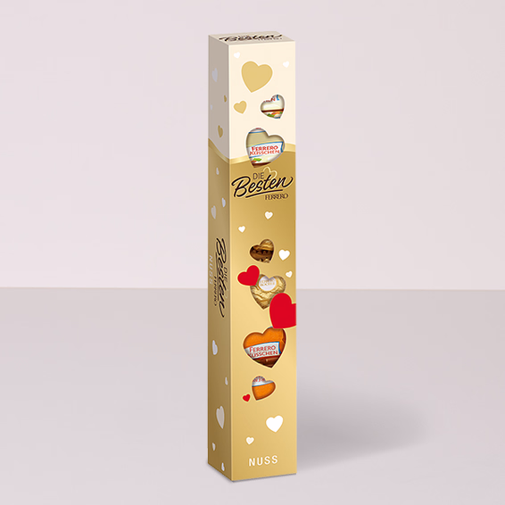 You will receive a gift packaging filled with Ferrero Küsschen in milk chocolate, Ferrero White Crispy and crunchy Rocher nut chocolates.