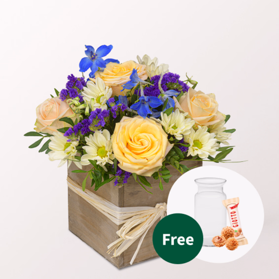 Arranged in a decorative wooden box (approx. 13 x 13 x 13,5 cm), this floral arrangement exudes a special charm. Cream coloured Top Fair roses, light yellow chrysanthemums, blue statice and blue delphiniums combine with fresh moss and pistochia to create a stylish overall look. An extraordinary floral greeting with natural charm and loving details.