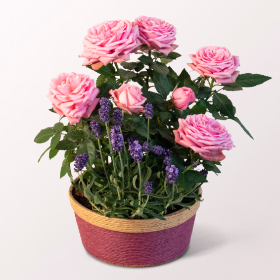 A delicate pink basket with a natural-coloured rim (approx. Ø 16 cm, height with plants approx. 25 cm), lovingly arranged with a pink rose and blue lavender. A fragrant, romantic eye-catcher – perfect for Mother’s Day.