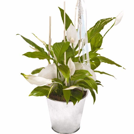 Spathiphyllum plant with white flowers in a ceramic or bamboo more