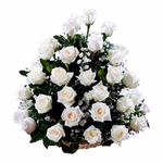 Let this splendid arrangement of three dozen white roses express your deepest sympathies. The pristine white roses come accented with greenery and baby's breath. Exquisitely arranged in a tasteful wicker basket, the roses face in one direction.