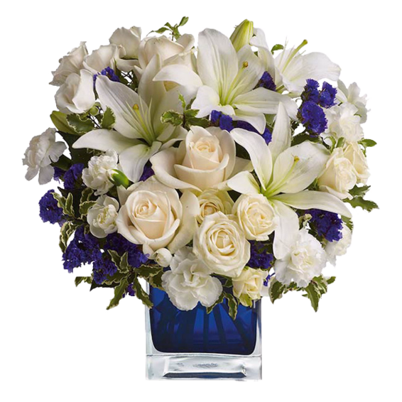 Your bouquet consists of beautiful cream coloured roses, spray roses, white Asiatic lilies, white miniature carnations, purple statice and a vase.